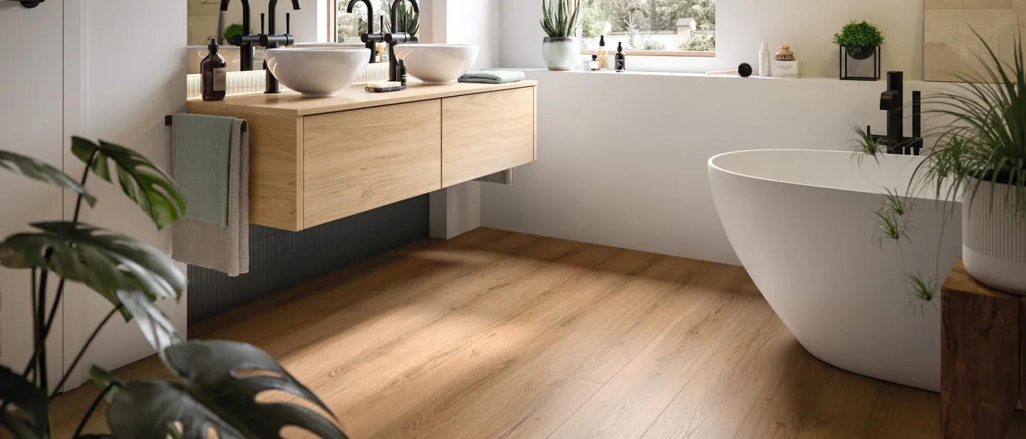 NatureSense Aqua laminatgulv er et skikkelig allrundprodukt som kan brukes på bad og kjøkken takket være den vanntette profilforseglingen